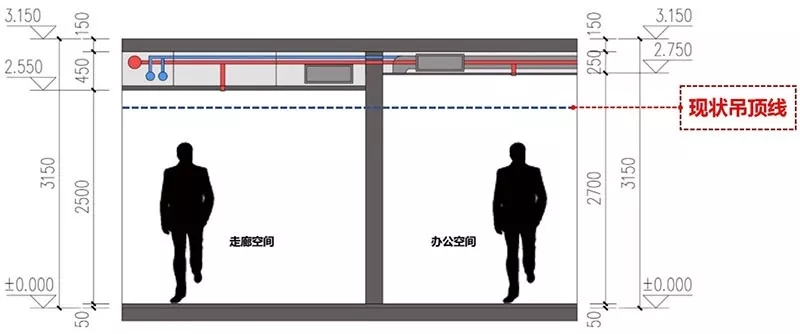 ⒈现状:现有建筑租户区层高3.15m,净高2.2m,受结构影响无法调整层高,可采用无吊顶设计,优化顶部管线设置,提高视觉 净高,改善办公空间。