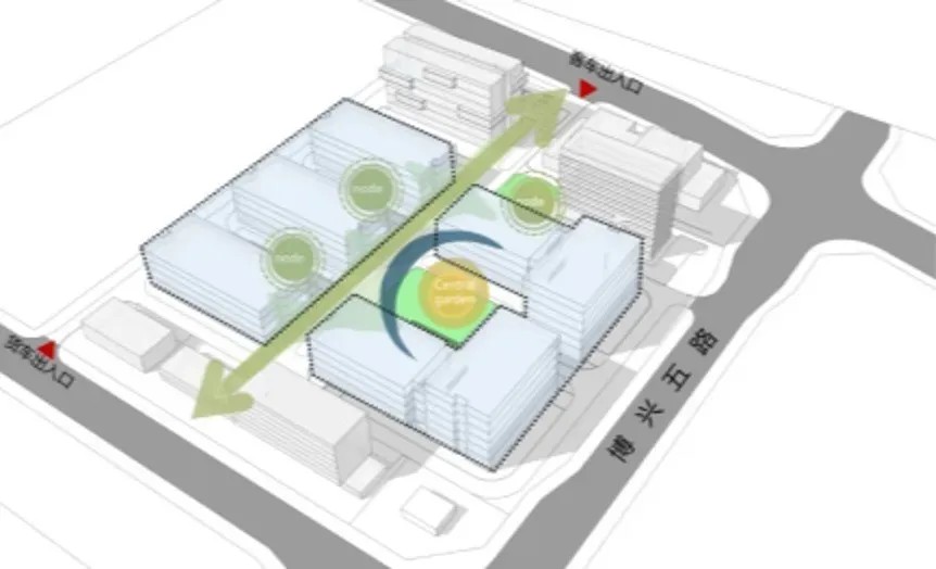 “一轴” 不仅是视觉通廊,更是功能纽带,串联研发、生产、交流等核心区域,两侧设置公共空间与景观设施,形成生态、科技、产业融合的活力走廊。 轴线两侧布局智能化的交通网络与休闲平台,促进企业间的协同创新。