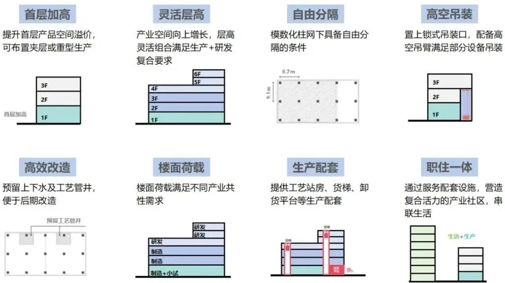 独栋厂房:适合中大型企业,提供独立入口与垂直客货流线,空间灵活可定制。 双拼厂房:适合中小型创新企业,降低初期成本,共享配套设施。