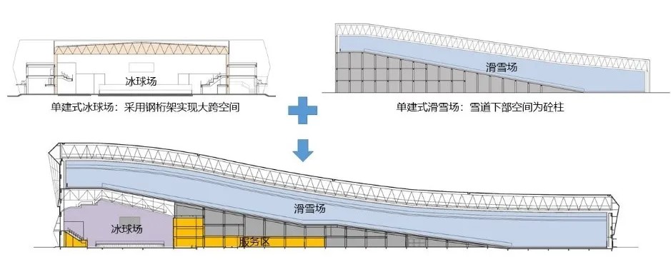 设计充分挖掘雪道高度、雪道下方空间的内在逻辑,把冰球馆设在雪道高区下方,把服务区以及设备机房、停车库也全部放在了雪道中部下方,在完全没有设计地下室的情况下,做到了空间利用的最大化,也实现了成本的最优化。