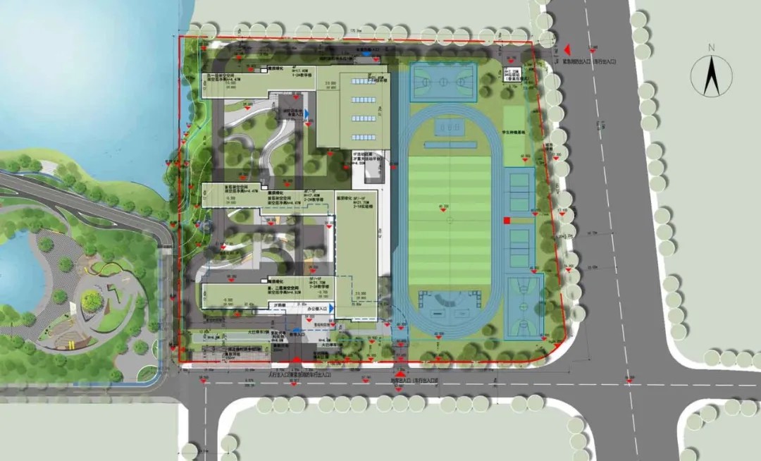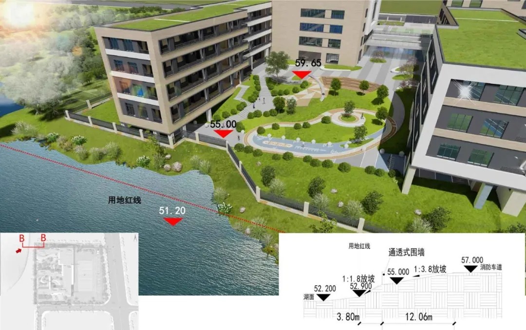 项目原始场地为东南高、西北低,场地设计策略完全尊重场地现状,采用东高西低的竖向设计原则。根据城市道路竖向标高推导出,东侧场地标高宜为60.10,为避免城市道路噪声影响,于该侧放置操场、室外球场等运动功能区。西侧场地标高根据坡度计算将地坪标高定位59.00,并高于场地西侧湖水的历史水位最高点。西侧场地规划为教学区与公共区等校园建筑组团,临近湖景环境优美且远离城市道路,既能为学生们提供稳定安静的教学环境,也能为学生们提供开阔的景观视野。并通过景观地形设计,在教学楼组团内打造景观自然坡地,以59.65向场地最低点55.00自然找坡。通过竖向设计打造竖向空间丰富的校园内部景观,将场地的景观资源价值发挥至最大(见图2,3)。