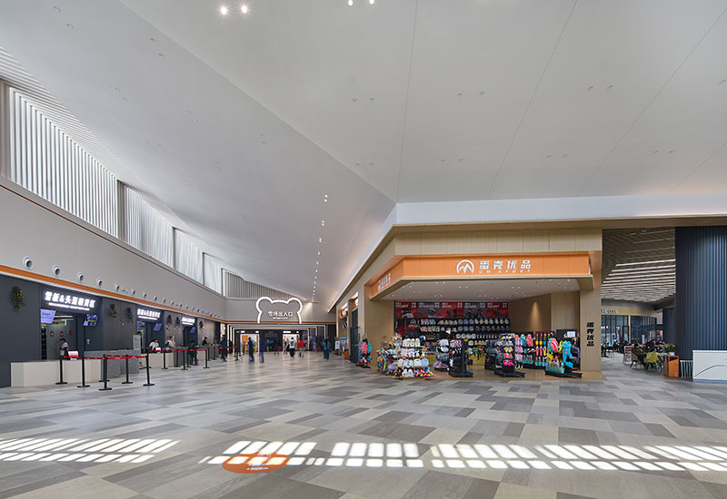 服务区空间重构:钻石型动线:突破传统"一"字布局,以圆形中庭为核心,分离常规滑雪动线(购票-租赁-更衣)与VIP/俱乐部专属通道,9米挑高增强采光与通风。