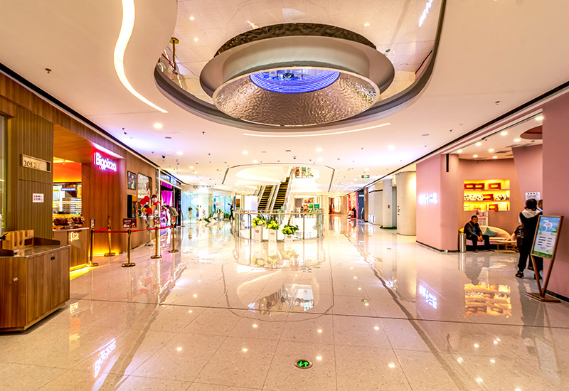 立面融合东坝河波光水纹元素,运用彩釉玻璃与光电幕墙塑造灵动地标形象,同时控制体量减少压迫感。中庭以“山环水绕”理念整合喷泉、曲线花坛与光电屏,形成森系沉浸式消费空间。